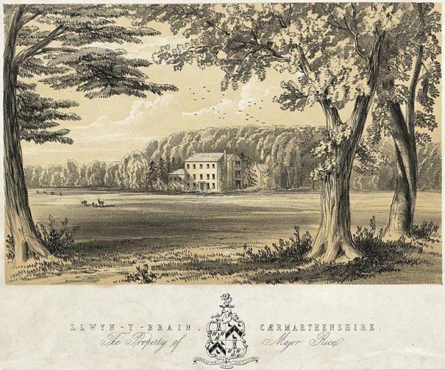 The lineage or ancestry of this branch of the Rice family tree traces back to an ancient family of Cambrian (similar to Welsh, Celtic British kingdoms in the medieval period after the wane of Rome) ancestry. Walter Rice was an Esquire of Llwyn-y-Brain, county Carmarthen, who married Elizabeth, daughter of Penoyre Watkins of county Brecon, Broadway, county Carmarthe, and by her has issue named Caroline and Walter. He died in 1793 and was succeeded by his son Walter. This Walter Rice was an Esquire of Llwyn-y-Brain, who married Mary Anne, daughter of Herbert Evans, an Esquire of Highmead, county Cardigan, and had the following issue with her: Walter, George Watkin (see below), Herbert Henry (married Isabella, daughter of General Munt, had issue named Herbert Henry, Edward John, and Henrietta Elizabeth), Mary Anne (married Lieutenant General Langermann of Chateau Province in Belgium, had sons named Godfrai George and Lieutenant General Langermann), Eliza Caroline, Margaretta Jane (married Pryse Pryse Lovenden, having issue named Sir Pryse Pryse, Baronet, Margaret, Walter, and Caroline Agnes) and Decima Dorothea (married John Pugh Vaughan Pryse of Bwlch Bychan, county Cardigan, had issue named Alice Eliza Maude, John Carbery Pugh, and Pryse, took the surname Vaughan). He died in 1844. His son, Walter George Watkins Rice was an Esquire of Llyn-y-Brain in county Carmarthen, Wales, a Justice of the Peace, Deputy Lieutenant, High Sheriff, Captain of the 23rd Royal Welch Fusiliers, and Major Royal Carmarthen Militia who was born in 1816. The arms of this branch of the Rice family tree are blazoned in heraldry as follows: Argent, a chevron ermine cotised sable, between three ravens of the last. Crest: A lion rampant proper, holding in his paw a bar shot sable. Motto: Cadarn-yw-fy-ffydd-y-portha-duw-y-gigfrain. The family seat (area where they held land, houses, titles, and positions) was Llyn-y-Brain, Llandovery, county Carmarthen, Wales, in present day United Kingdom.