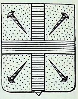 Bologne – Coupé d’or sur sable le sable chargé d’un mont de trois coupeaux d’or mouv de la pointe touchant à la ligne du coupé et sommé de trois clous de sable sur l’or les pointes en bas Au chef de l’écu d’azur ch de trois fleurs-de-lis d’or rangées entre les quatre pendants d’un lambel de gueules